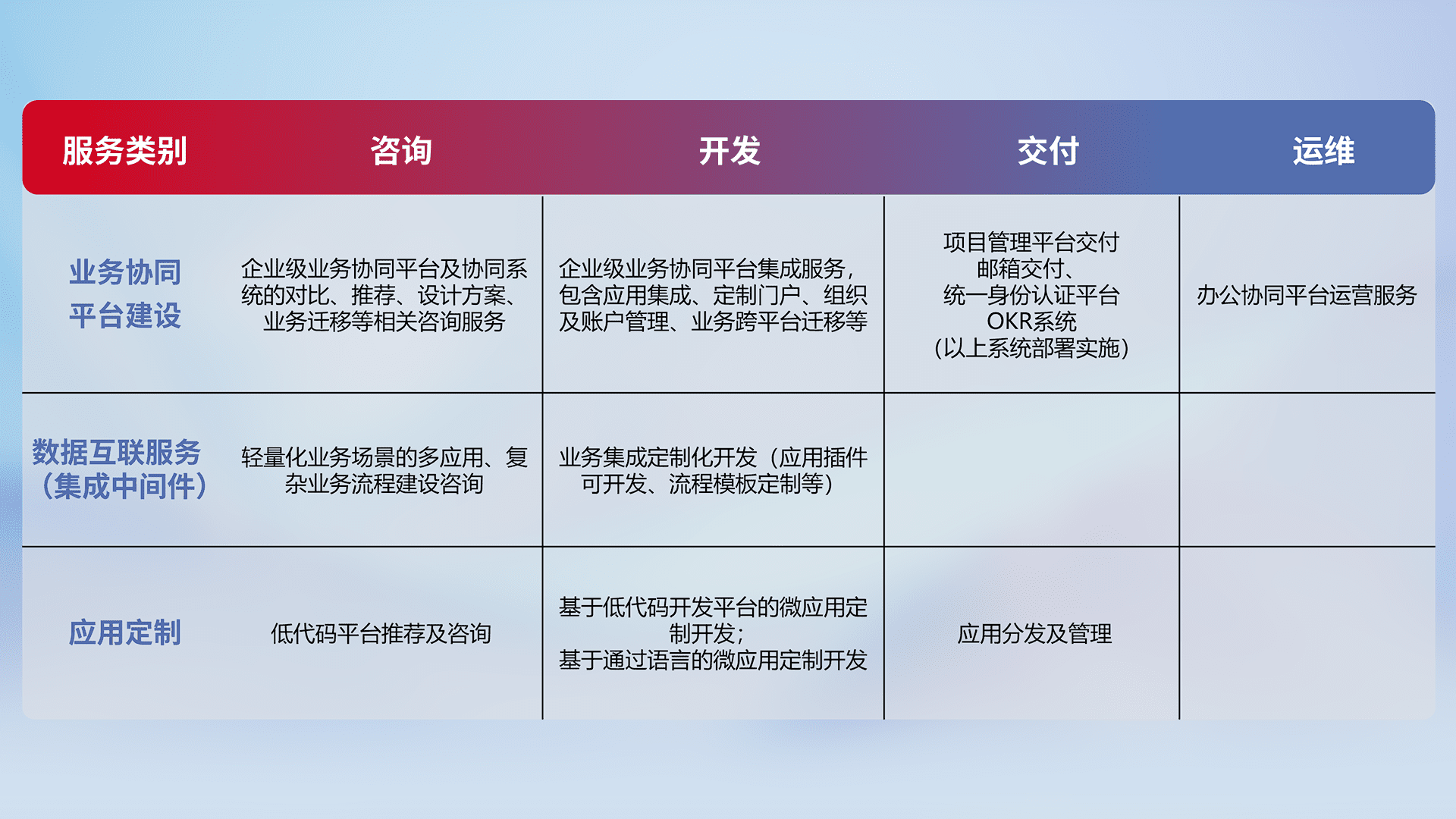 针对钉钉、、、企微、、、、IDaas等平台级产品提供产品的规划、、方案、、、交付、、、、定制化开发等服务,,实现如统一协同办公、、智能客户服务、、、、混合会议管理、、、智能数据查询、、等业务场景,,,实现数字化转型。。。